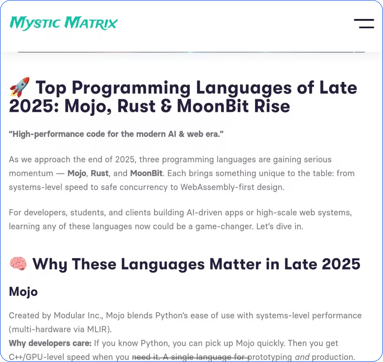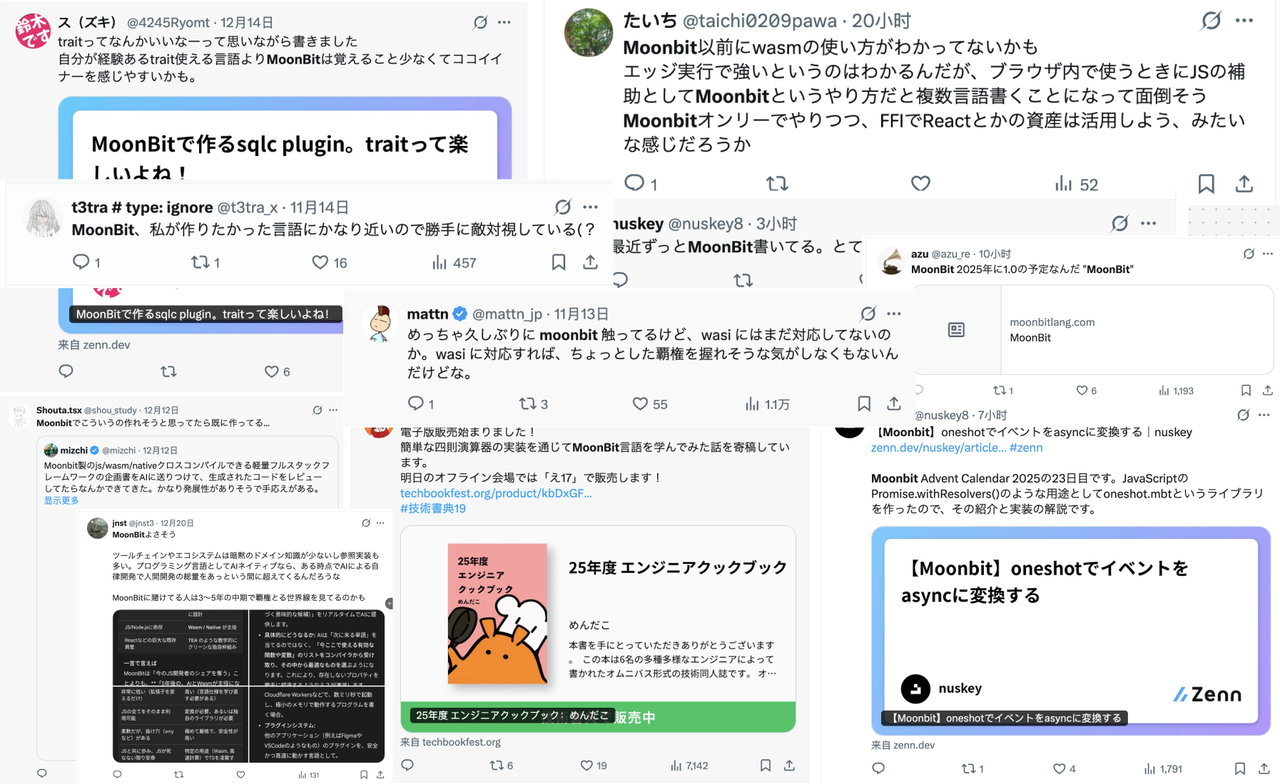 进入 2025 年,技术社区对 MoonBit 的讨论热度持续上升,包括知名日本开发者 mizchi 在内的多位技术意见领袖,陆续在博客与社交平台上分享基于 MoonBit 的实践经验与技术观察,涉及 WebAssembly、语言工具链以及 AI 编程等多个方向。