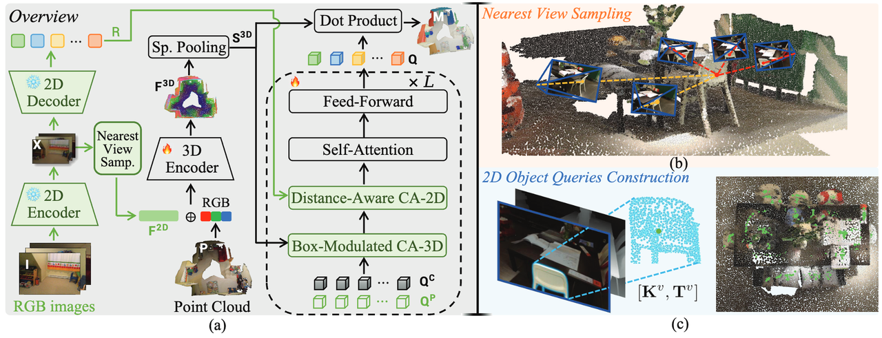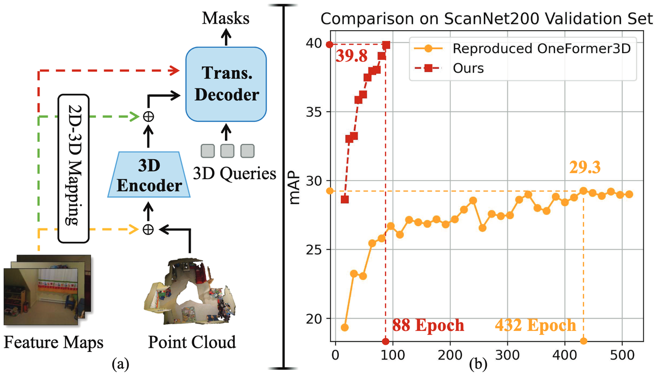 该框架引入成熟 2D 检测模型的能力,开创性地使用通过图像级(全局场景特征)与物体级(局部实例特征)的双层级融合范式,基于 2D 信息增强对 3D 场景内的空间结构、物体尺度关系与实例边界等信息的理解,在大幅提升 3D 实例分割检测精度的同时,显著加快模型训练收敛速度。