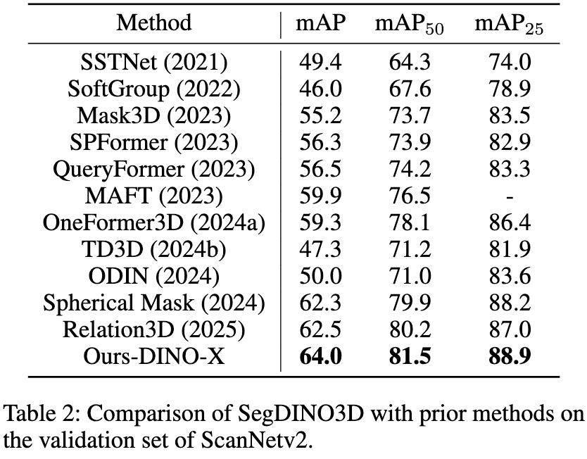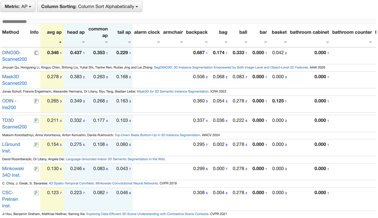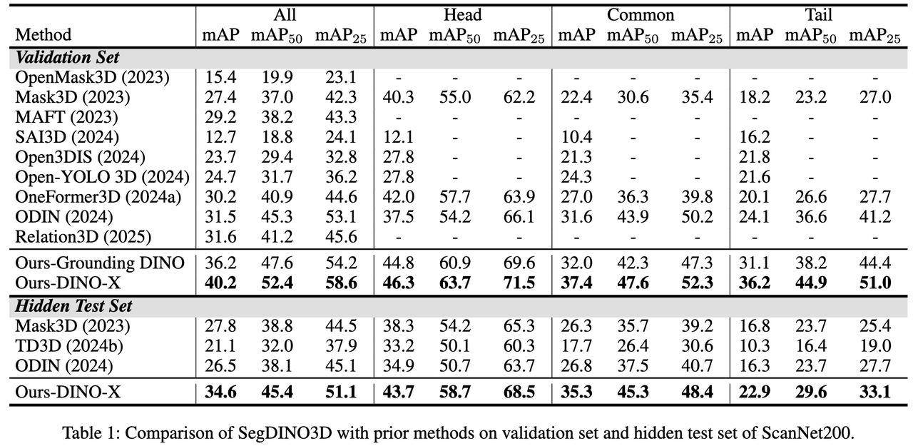 SegDINO3D 在 ScanNetv2 与 ScanNet200 等主流基准数据集上取得 SOTA(State-of-the-Art),在更具挑战性、拥有更多长尾类别的 ScanNet200 benchmark 上实现了性能的巨大飞跃,相较于之前的方法,在 validation 和 hidden test sets 上分别提升了 + 8.6mAP 和 + 6.8mAP。
