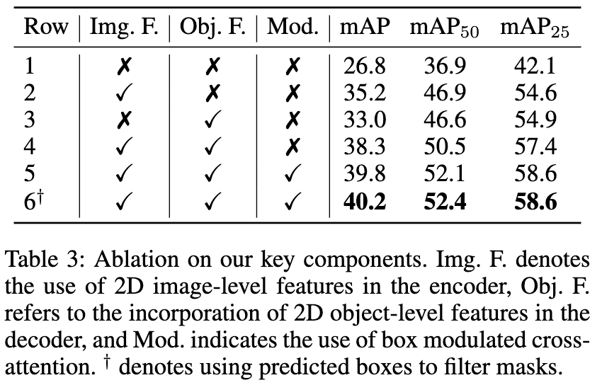 具体而言,SegDINO3D 先利用 2D 检测模型处理输入的图片并检测其中所有要求类别的物体,并设置阈值保留输出的高置信度的 queries。之后利用深度信息与相机参数将它们投影到 3D 空间,并通过 FPS 降采样保留 2048 个。