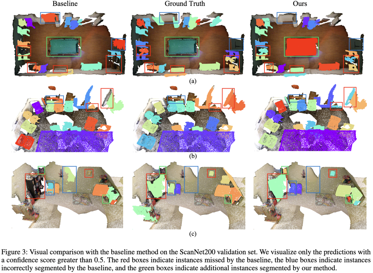 实验验证表明,该框架不仅使训练收敛速度显著提升,更在 ScanNetv2 与 ScanNet200 等主流基准数据集上取得 SOTA(State-of-the-Art)性能,尤其在拥有更丰富长尾类别而更具挑战性的 ScanNet200 基准数据集上,验证集与隐藏测试集的 mAP 指标分别实现 +8.6mAP 与 +6.8mAP 的大幅跃升,为复杂场景下的 3D 实例分割提供了全新的高性能解决方案。
